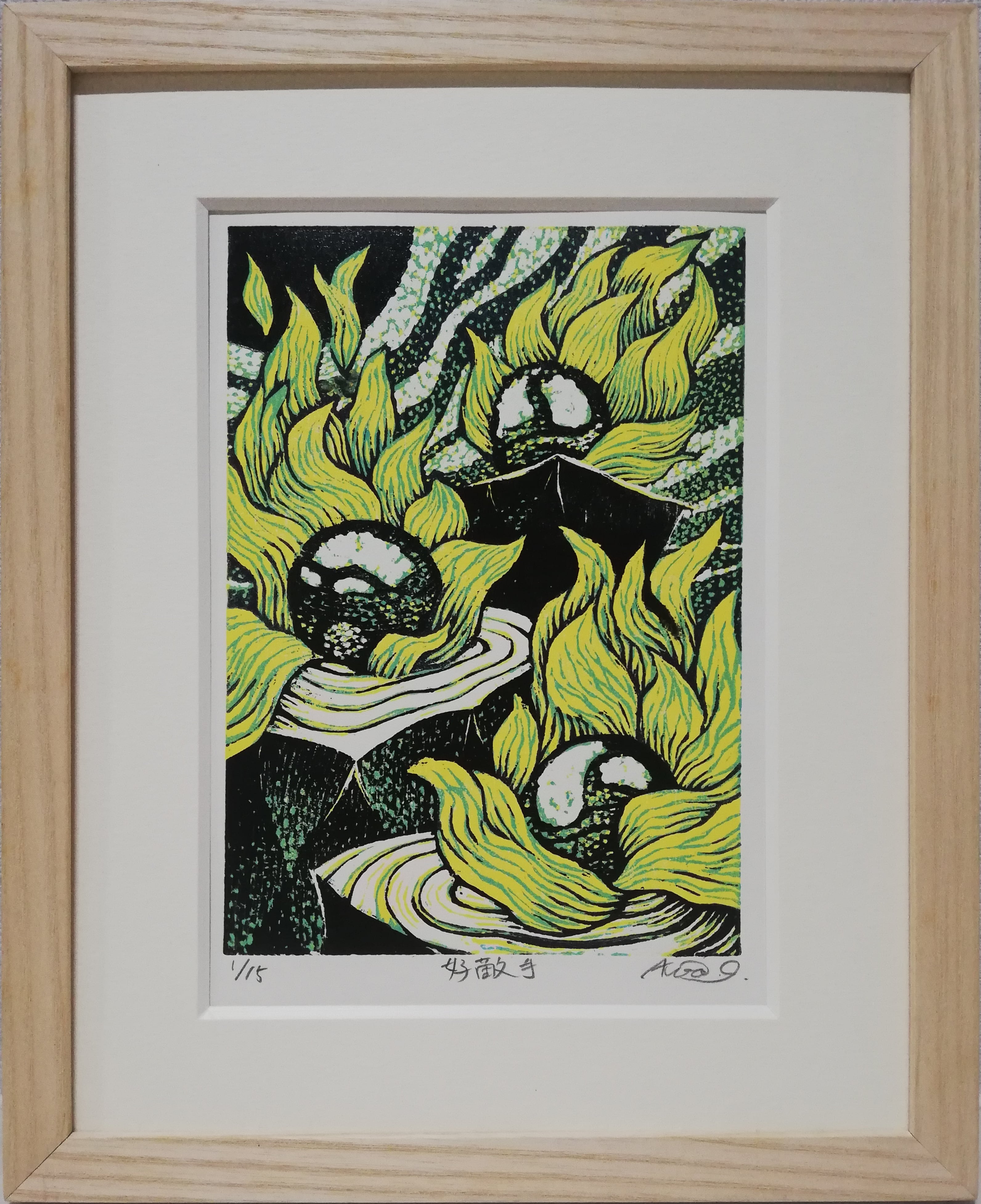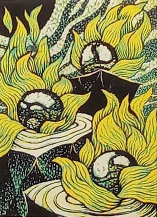身の周りのありふれた出来事や世相などをテーマに、植物の部位や在り方から感じられる「生き物」としての強烈な存在感を転換して、「人間」の内や外を作者なりに表現しようと、木版画での表現にて葛藤しております。