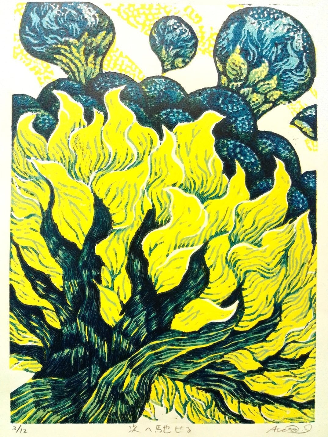 身の周りのありふれた出来事や世相などをテーマに、植物の部位や在り方から感じられる「生き物」としての強烈な存在感を転換して、「人間」の内や外を作者なりに表現しようと、木版画での表現にて葛藤しております。