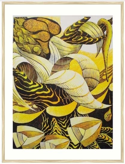 彫りすすめによる凸版木版画 油性インク刷りと一部水性手彩色